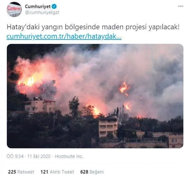 Cumhuriyet ve Birgün gazeteleri ile Halk TV'nin de bulunduğu medya organları yangının maden projesi için çıkarıldığını öne sürerek algı operasyonu yaptı. Cumhuriyet ve Birgün gazeteleri yanan yerlerde maden projesi olduğu şeklinde alçak bir algı operasyonu için kolları sıvadı. Cumhuriyet, "Hatay'daki yangın bölgesinde maden projesi yapılacak!", Birgün "Hatay'da yerleşim yerlerini etkileyen yangının bulunduğu bölgede maden projesi yapılacağı ortaya çıktı!", Halk TV "Yangının çıktığı yerde maden projesi yapılacakmış" diye asılsız iddilarla hükümeti hedef almaya kalktı. Aynı dakikalarda firari FETÖ'cü Emre Uslu'nun da aynı minvalde tweet atması kimlerin kimlerle aynı dili kullandığını açıkça göstermiş oldu.